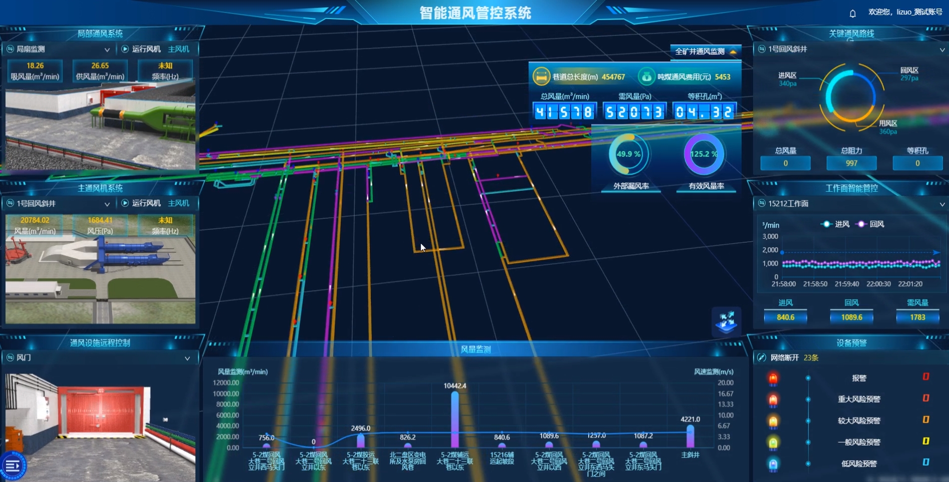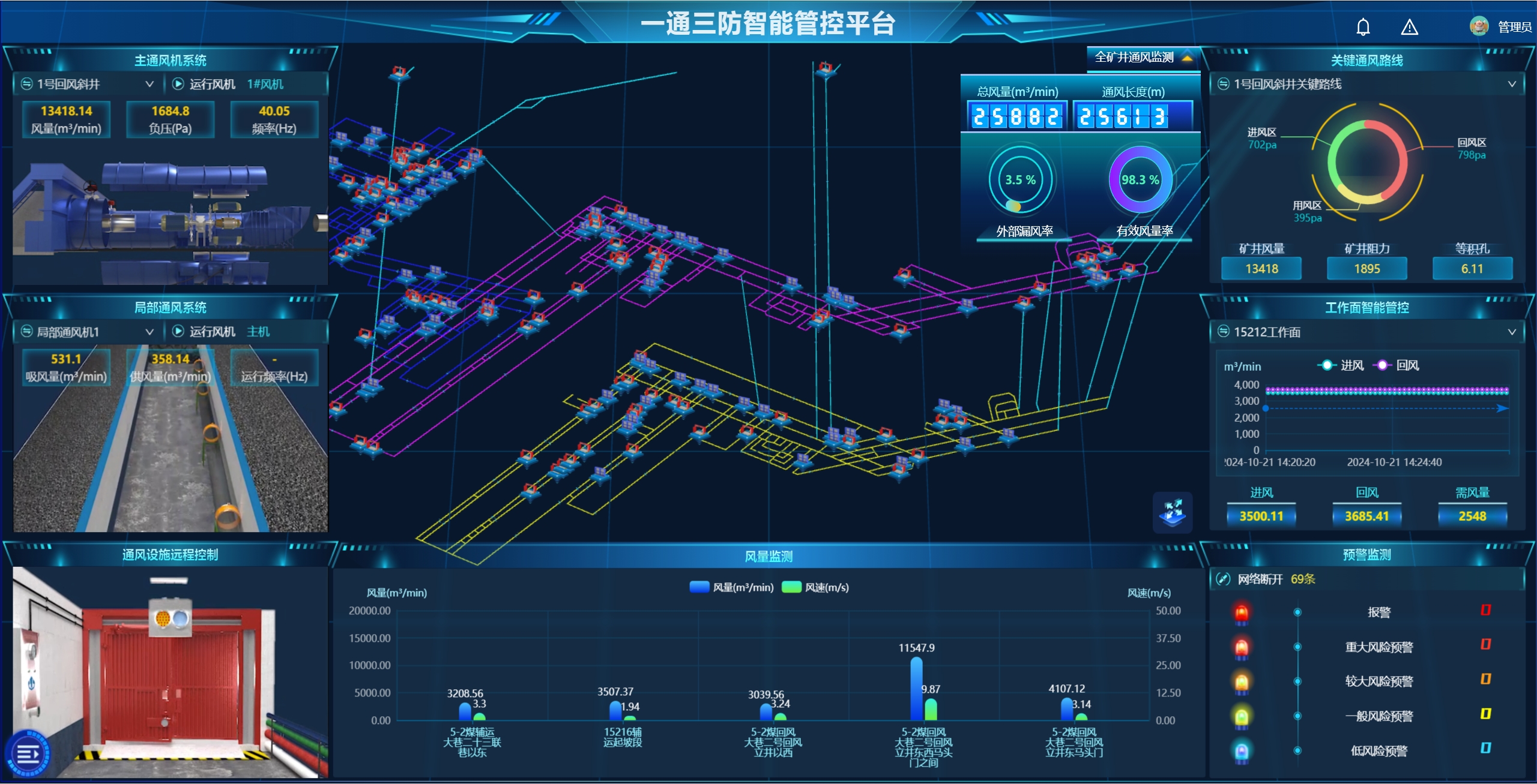 Mine ventilation and disaster prevention system is an intelligent analysis, decision-making, control, and information management system. It encompasses five core functions: first, real-time calculation and analytical evaluation of ventilation networks; second, intelligent regulation of air volume and auxiliary decision-making for emergency ventilation control in case of disasters; third, early warning and risk analysis for ventilation and disaster prevention; fourth, integrated control of ventilation and prevention equipment and facilities; fifth, three-dimensional digital twin and information management. Currently, the system has been upgraded to version 6.0, unifying data standards, including data from multiple subsystems such as ventilation, fire prevention, dust prevention, and gas, and enabling the integration of systems such as safety monitoring, personnel positioning, broadcasting, and video surveillance.