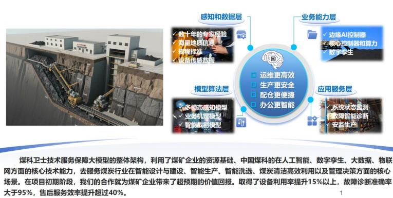 The project focuses on the intelligent transformation of coal mining, aiming to solve key problems in the safe production and mining continuity of coal production enterprises. By integrating large language models, knowledge graphs, and the Internet of Things, a "Coal Science Guardian Large Model" is created. A three-tier system of large language models in the coal vertical field, business scenario agents, and intelligent operation and maintenance platforms is built. The project focuses on solving industry pain points such as equipment operation and maintenance relying on manual labor, lagging fault warnings, insufficient identification of safety hazards, and inefficient production planning and spare parts allocation.