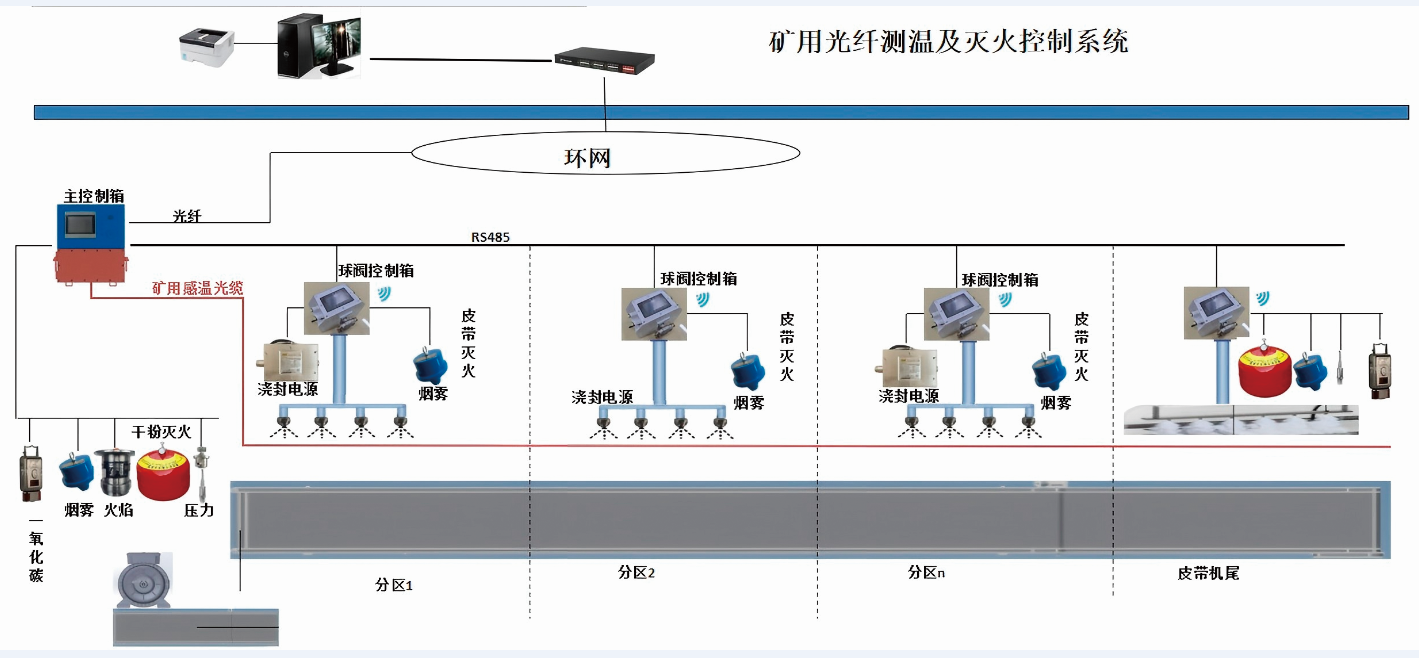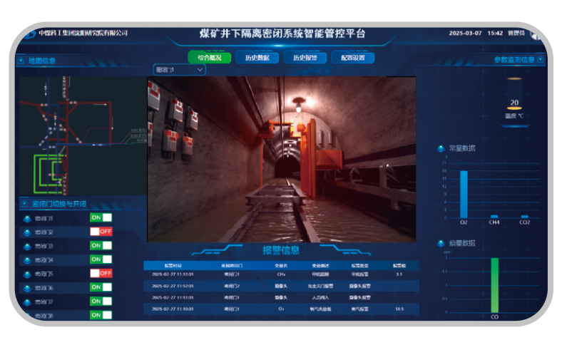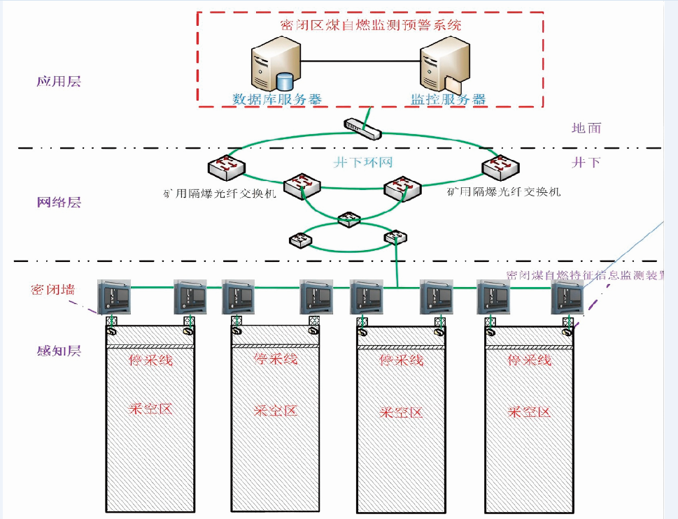 煤矿内因火灾智能预警装备及平台融合了煤矿自然发火激光束管监测系统、矿用本安型光纤分布式测温系统、矿用本安型多参数巡检装置(密闭监测系统)、矿用采空区光栅光纤风速监测装置等先进火灾信息感知装备,可实现采空区自然火灾气体、温度和漏风流畅协同监测。基于“云、边、端”架构,集成全矿井尺度内、外因火灾敏感信息,定制开发智能防灭火平台,火灾态势评估、火情分级预警、应急隐患排查、GIS三维地图等功能,可用于灾前预警、灾前监测和灾后救援,为指导矿井安全开采、评估安全风险、精准实施防火措施提供可靠的数据及技术支撑。