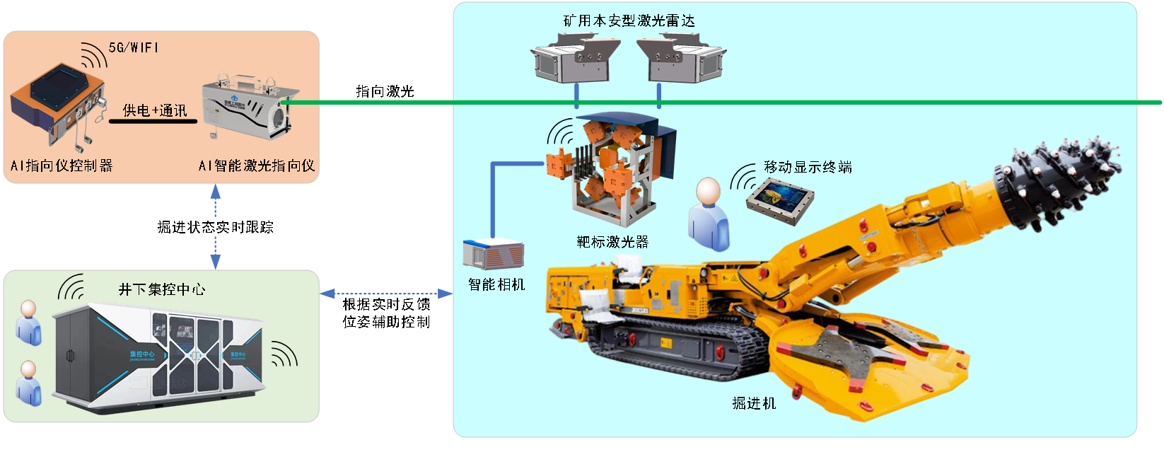 The system consists of a laser pointer, a pointer controller, a target, a mine-used intrinsically safe laser radar, and a mobile display terminal. It performs real-time target tracking of the target through the intelligent vision system built into the laser pointer, and measures the position and attitude of the roadheader body based on the photogrammetry principle; at the same time, it realizes 3D modeling of the roadway via the mine-used intrinsically safe laser radar.