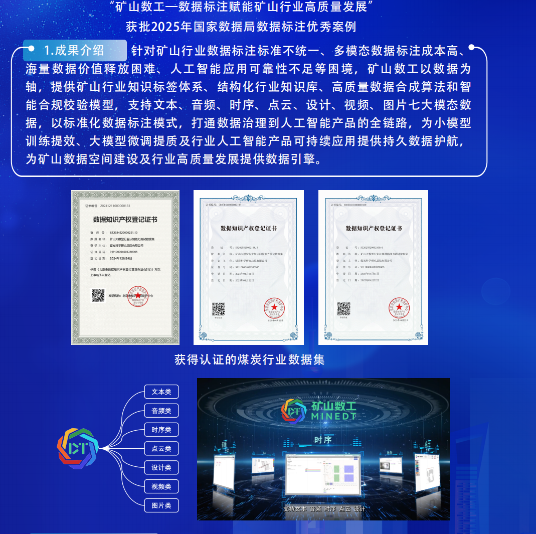 By building a full-process intelligent data system, the Mine Dt has significantly improved the data application efficiency of the mining industry. Targeting the pain points of low efficiency and high cost in data annotation, it has established a mine scenario-level tag system, developed standardized annotation templates by integrating seven major modal data, and realized unified annotation of 50-billion-level sensing data, 3 million video data and 20-billion-token text data, supporting the agile training of small models.